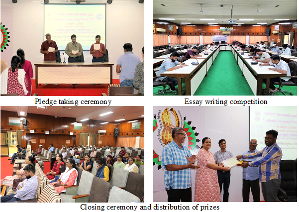 The Vigilance Awareness Week 2022 (31st October 2022 to 6th November 2022), with the focus ‘’Corruption Free India for a Developed Nation’’ was organized at ICAR-Directorate of Groundnut Research, Junagadh. The week began with the Pledge taking ceremony with the oath administered to the DGR staff by Director, DGR. Two competitions were organized viz. elocution and essay writing competition for all the employees of the Directorate. The elocution competition on the topic ‘’Corruption Free India for a Developed Nation’’ was organized on 2nd November 2022 in both Hindi and English languages, and 11 employees participated in the competition. Similarly, on 3rd November 2022 Essay Writing Competition was organized on “Self Reliance with Integrity’’in both English and Hindi languages and 23 employees participated in the event. On 4th November closing ceremony was held at 5:00 pm. Winners of different events were awarded with prizes and a certificate. In his remarks in the closing ceremony, Director (Incharge), Dr. S. K. Bera highlighted the need for self-introspection and making everyone aware about maintaining absolute integrity in public life to take country forward towards a developed nation. Dr. K. K. Pal, VO of the institute, emphasized the importance of making integrity a part of heart and soul to make society corruption free