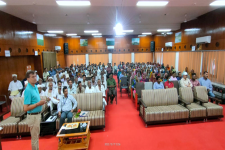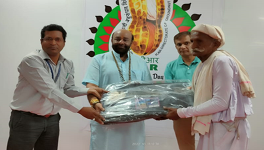 The ICAR-Directorate of Groundnut Research, Junagadh has organized a Farmer’s Interactive session on 17th October, 2022 at its premises coinciding with the Agri – Startup Conclave and Kisan Sammelan at Mela Ground of ICAR- IARI, New Delhi by Ministry of Agriculture & Farmers Welfare. The interactive Kisan Mela was attended by farmers from Kukaswada, Maktupur and Langodara, Ivnagar and adjoining areas of Junagadh District. During the interactive session the difficulties faced by the farmers in cultivation of crops and its remedies in this part of the states of Gujarat was discussed by Dr. C.S. Praharaj, Acting Director, ICAR-DGR, Junagadh. The Deputy Mayor of Junagadh, Sh. Girishbhai Kotecha was invited as the chief Guest for the function. This was followed by live telecast of the events of Agri–Startup Conclave and Kisan Sammelan and the address of the Hon’ble Prime Minister of the India, Shri Narendra Modi. A total of 260 including 150 men farmers 30 women farmers and 80 staff members of ICAR-DGR participated in the Interaction session and watched the Webcast of our Prime Minister. Tarpaulin Sheets were also distributed to 70 farmers under the TSP Programme operational at ICAR-DGR by Hon’ble Chief Guest
